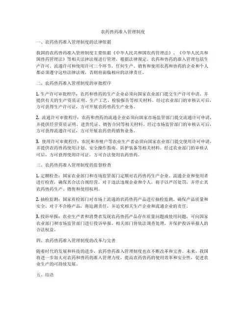二、农药兽药准入管理制度的审批程序1. 生产许可审批程序:农药和兽药的生产企业必须向国家农业部门提交生产许可申请,并提供有关的生产资质证明、生产工艺、检验报告等相关材料。