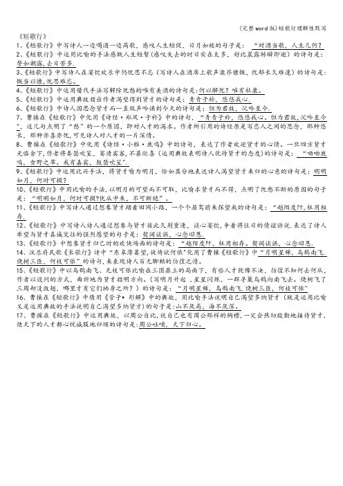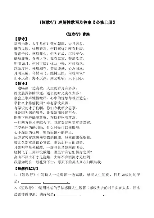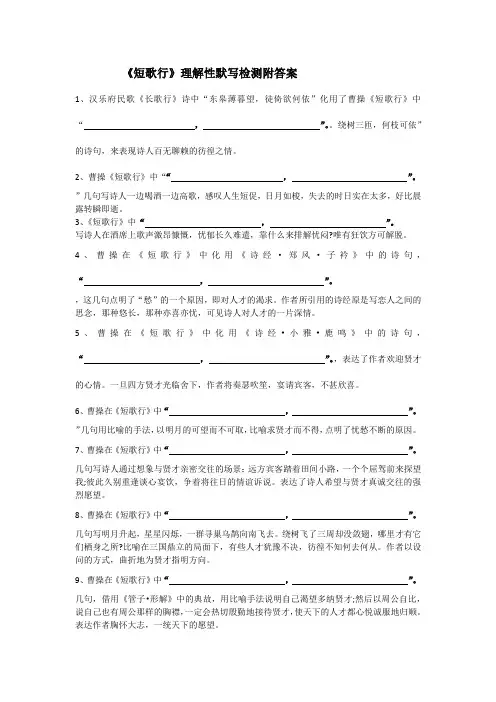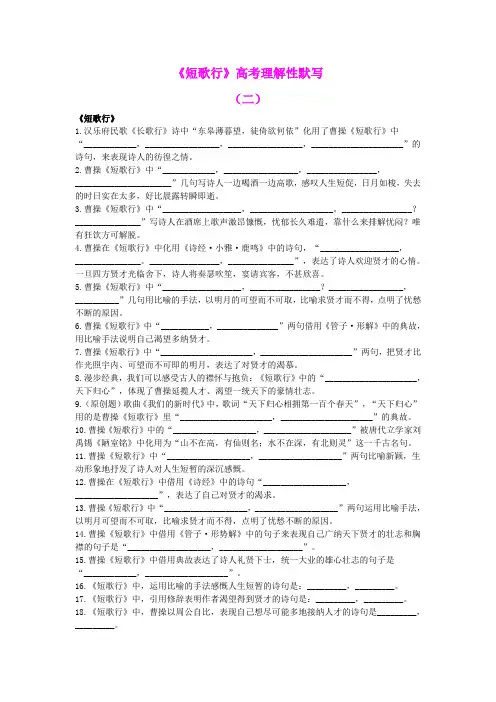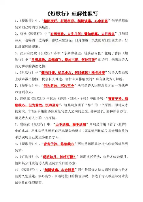 (完整word版)短歌行理解性默写《短歌行》1、《短歌行》中写诗人一边喝酒一边高歌,感叹人生短促,日月如梭的句子是:“对酒当歌,人生几何?2、《短歌行》中运用比喻的手法感慨人生短暂(感叹失去的时日实在太多,好比晨露转瞬即逝)的诗句是:譬如朝露,去日苦多.3、《短歌行》中写诗人在宴饮欢乐中仍忧思不忘(写诗人在酒席上歌声激昂慷慨,忧郁长久难遣)的诗句是:慨当以慷,忧思难忘。