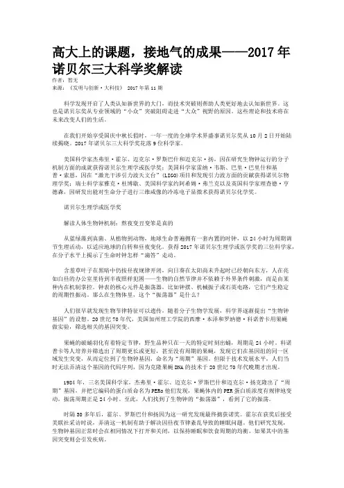 高大上的课题,接地气的成果——2017年诺贝尔三大科学奖解读作者:暂无来源:《发明与创新·大科技》 2017年第11期科学发现开启了人类认知新世界的大门,而技术突破则帮助人类更好地去认知新世界。