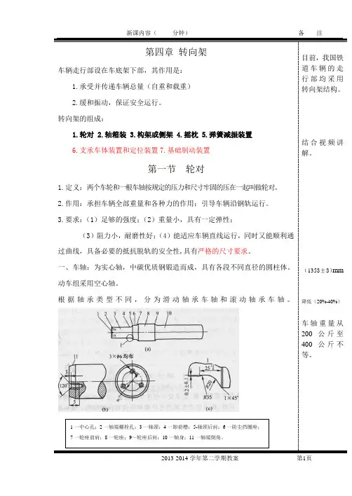 第四章转向架车辆走行部设在车底架下部,其作用是:1.承受并传递车辆总量(自重和载重)2.缓和振动,保证安全运行。