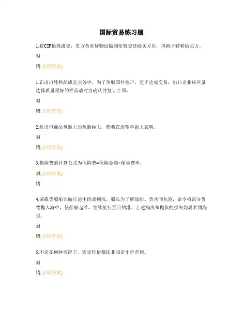 对错(正确答案)1.在出口凭样品成交业务中,为了争取国外客户,便于达成交易,出口企业应尽量选择质量最好的样品请对方确认并签订合同。