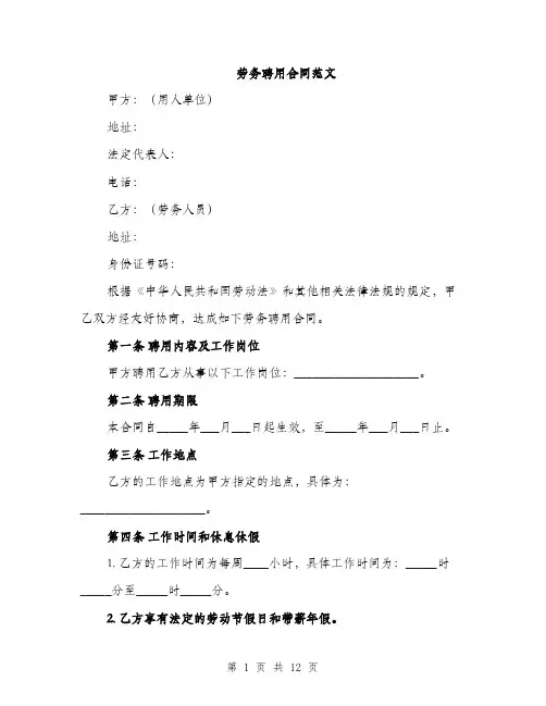 劳务聘用合同的范本(7篇通用)劳务聘用合同的范本篇1甲方:_________乙方:_________鉴于甲方工作需要,聘请乙方从事劳务工作,根据《中华人民共和国合同法》和有关规定,甲乙双方经平等协商一致,自愿签订本劳务协议,以资共同遵守。