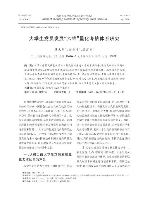 关键词:党员发展;量化考核;大学生党员中图分类号:D267.6文献标识码:A文章编号:1672-9617(2024)02-0119-07收稿日期:2023-09-30基金项目:辽宁省高校党建研究项目(2022GXDJ -ZD034);教育部人文社会科学研究专项任务项目(高校辅导员研究)(22JDSZ3135)作者简介:杨文军(1984-),女(回族),辽宁本溪人,副教授,硕士。