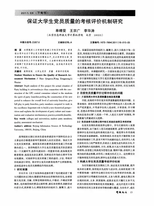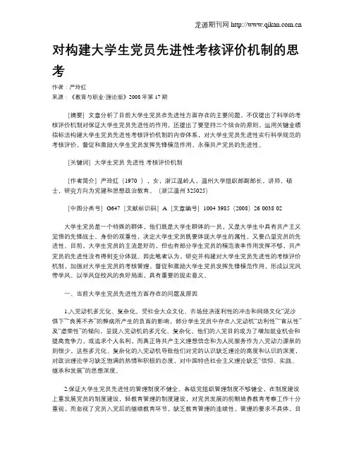对构建大学生党员先进性考核评价机制的思考作者:严玲红来源:《教育与职业·理论版》2008年第17期[摘要]文章分析了目前大学生党员在先进性方面存在的主要问题,不仅提出了科学的考核评价机制对保证大学生党员先进性的作用,还提出了要坚持三个结合的原则,运用关键业绩指标法构建大学生党员先进性考核评价机制的内容体系,对大学生党员先进性实行科学规范的考核评价,督促和激励大学生党员发挥先锋模范作用,永葆共产党员的先进性。