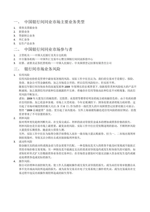 一、中国银行间同业市场主要业务类型1.债券及票据业务2.拆借业务3.贷款转让业务4.外汇业务5.衍生产品业务二、中国银行间同业市场参与者1.主管机关——中国人民银行及其分支机构2.中介服务机构——中国外汇交易中心暨全国银行间同业拆借中心3.结算、清算及证券托管机构——中国人民银行、中央国债登记结算有限责任公司三、银行间市场业务风险1.信用风险信用风险也恰恰是管理中最容易忽视的风险。