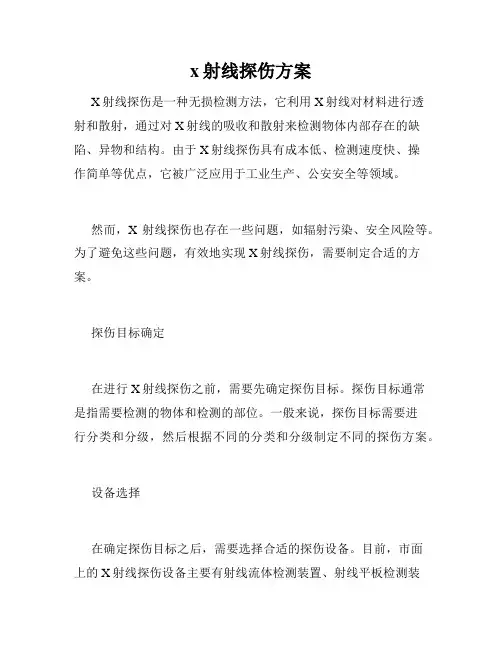x射线探伤方案X 射线探伤方案一、引言二、探伤设备选择1、 X 射线机根据被检测工件的材质、厚度和形状,选择合适的X 射线机类型,如便携式、固定式等。