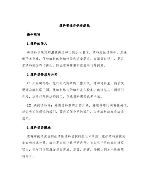 填料塔操作保养规程操作规程1. 填料的导入将填料以规定的灌装高度和比例加入塔内。