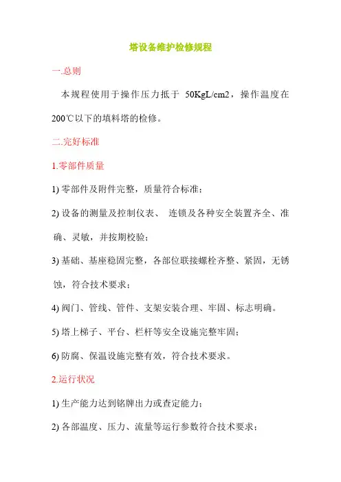 塔设备维护检修规程一.总则本规程使用于操作压力抵于50KgL/cm2,操作温度在200℃以下的填料塔的检修。