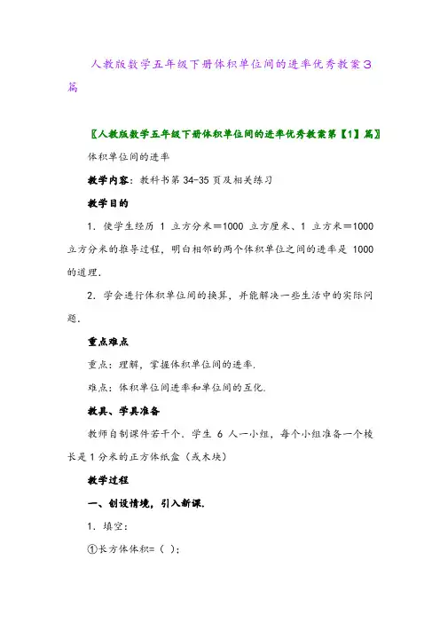 人教版数学五年级下册体积单位间的进率优秀教案3篇〖人教版数学五年级下册体积单位间的进率优秀教案第【1】篇〗体积单位间的进率教学内容:教科书第34-35页及相关练习教学目的1.使学生经历1立方分米=1000立方厘米、1立方米=1000立方分米的推导过程,明白相邻的两个体积单位之间的进率是1000的道理.2.学会进行体积单位间的换算,并能解决一些生活中的实际问题.重点难点重点:理解,掌握体积单位间的进率.难点:体积单位间进率和单位间的互化.教具、学具准备教师自制课件若干个.学生6人一小组,每个小组准备一个棱长是1分米的正方体纸盒(或木块)教学过程一、创设情境,引入新课.1.填空:①长方体体积=();②正方体体积=()。