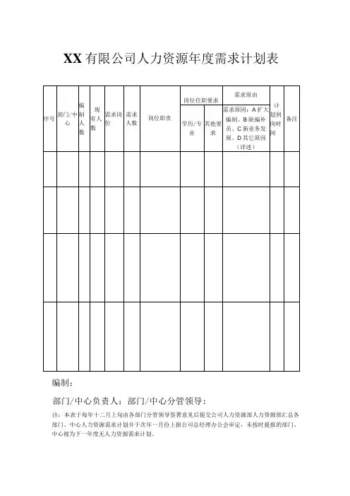 人员需求表说明:1、此表由用人部门填写,每表限填一个职位,交于人力资源部门;2、在类别中,假如用人部门申请职位在编制内则为填补空缺,否则为超编制或者只能临时雇用;3、任职资格由职位说明书确定,若有特殊要求或者职位说明书未建,请在其他能力要求中填写;4、人力资源部门将作出是否受理的建议。