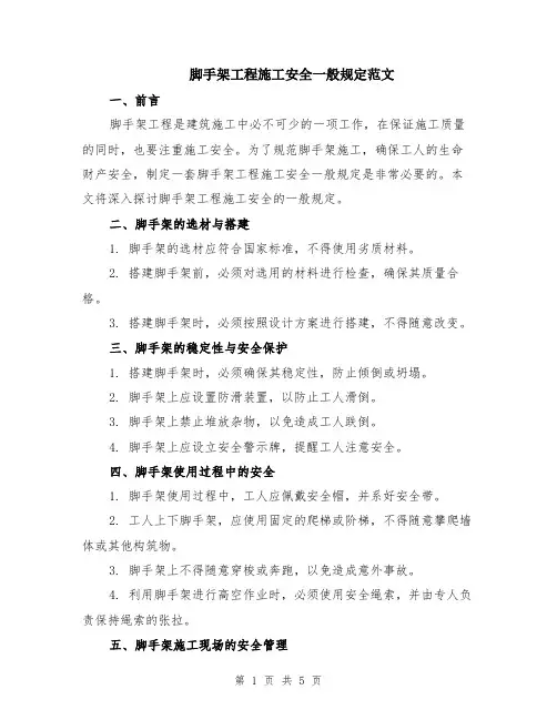 脚手架工程施工安全一般规定范文一、前言脚手架工程是建筑施工中必不可少的一项工作,在保证施工质量的同时,也要注重施工安全。