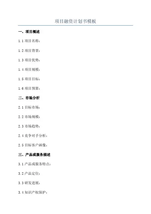 项目融资计划书范本项目融资计划书范本精选5篇(一)工程融资方案书范本一、工程概述1.1 工程名称:1.2 工程背景:1.3 工程目的:1.4 工程规模:1.5 工程市场前景:1.6 工程竞争优势:二、市场分析2.1 目的市场定位:2.2 目的市场规模:2.3 市场需求分析:2.4 竞争分析:2.5 市场营销策略:三、工程施行方案3.1 工程施行步骤:3.2 资需求:3.3 施行时间表:四、财务分析4.1 资本预算:4.2 财务预测:4.3 投资回报率:4.4 资金筹措方案:五、风险与对策5.1 工程风险:5.2 风险评估:5.3 风险对策:5.4 应急预案:六、团队与组织6.1 创始团队介绍:6.2 组织架构:6.3 人员招聘:6.4 人员培训:七、融资需求与用处7.1 融资需求:7.2 融资用处:7.3 融资方式:7.4 融资条件:八、财务指标8.1 资产负债表:8.2 利润表:8.3 现金流量表:九、投资回报与退出机制9.1 投资回报:9.2 退出机制:十、其他附件10.1 工程方案书:10.2 财务报表:10.3 资料附件:以上为工程融资方案书的一般范本,请根据详细工程的情况进展详细的填写和修改。