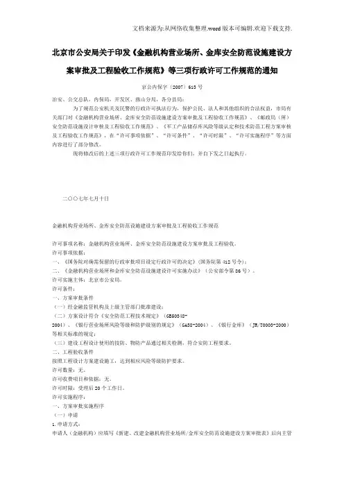 北京市公安局关于印发《金融机构营业场所、金库安全防范设施建设方案审批及工程验收工作规范》等三项行政许可工作规范的通知京公内保字〔2007〕613号治安、公交总队,内保局,开发区、燕山分局,各分县局:为了规范公安机关及民警的行政许可执法行为,保护公民、法人和其他组织的合法权益,市局有关部门对《金融机构营业场所、金库安全防范设施建设方案审批及工程验收工作规范》、《邮政局(所)安全防范设施设计审核及工程验收工作规范》、《军工产品储存库风险等级认定和技术防范工程方案审核及工程验收工作规范》,在“许可事项依据”、“许可条件”、“许可时限”、“许可实施程序”等方面内容进行了部分修改。