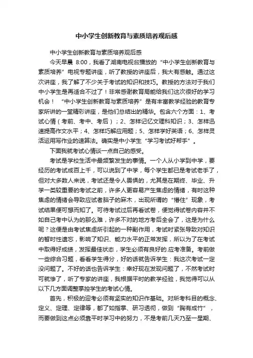 中小学生创新教育与素质培养观后感中小学生创新教育与素质培养观后感今天早晨8:00,我看了湖南电视台播放的“中小学生创新教育与素质培养”电视专题讲座,听了教授的讲座后,我大有感触。