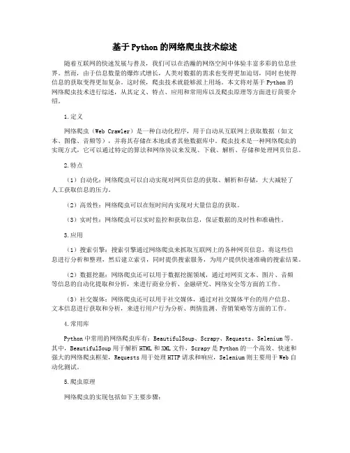 一、Python网络爬虫的概念与特点Python网络爬虫是一种通过模拟浏览器行为,在互联网上自动获取和处理信息的程序。