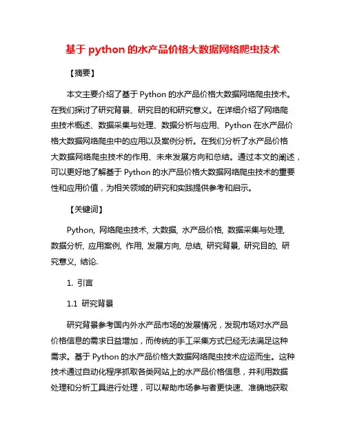 三、Python网络爬虫在农业大数据方面的价值1. 提高农业生产效率利用Python网络爬虫获取各种农业信息,可以帮助农民更好地进行农业生产管理,降低生产成本,提高生产效率。