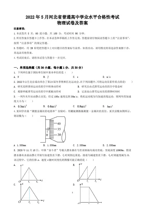 2022年河北省邯郸市大名第一中学高一物理月考试题含解析一、选择题:本题共5小题,每小题3分,共计15分.每小题只有一个选项符合题意1. 以下物理量:重力势能、重力加速度、动能、功、功率5个物理量中有几个是矢量()A、1个B、2个C、3个D、4个参考答案:A2. 关于速度和加速度的关系,下列说法中正确的是()A. 速度变化越大,加速度就一定越大B. 速度为零,加速度就一定为零C. 速度很小,加速度可能很大D. 速度很大,加速度可能是零参考答案:CD3. (单选)如图所示,用拇指、食指捏住圆规的一个针脚,另一个有铅笔芯的脚支撑在手掌心位置,使OA水平,然后在外端挂上一些不太重的物品,这时针脚A、B对手指和手掌均有作用力,对这两个作用力方向的判断,下列各图中大致正确的是()参考答案:C4. 有三个力:F l = 2N,F2 = 5N,F3 = 8N,则()A.F2和F3可能是F l的两个分力B.F l和F3可能是F2的两个分力C.F l和F2可能是F3的两个分力D.上述结果都不对参考答案:D【解题思路】F2和F3合力范围为:,即,而F l = 2N不在此范围内,选项A错误;F l和F3合力范围为:,即,而F2= 5N不在此范围内,选项B错误;F l和F2合力范围为:,即,而F3 = 8N不在此范围内,选项C错误;由以上可知D说法正确。