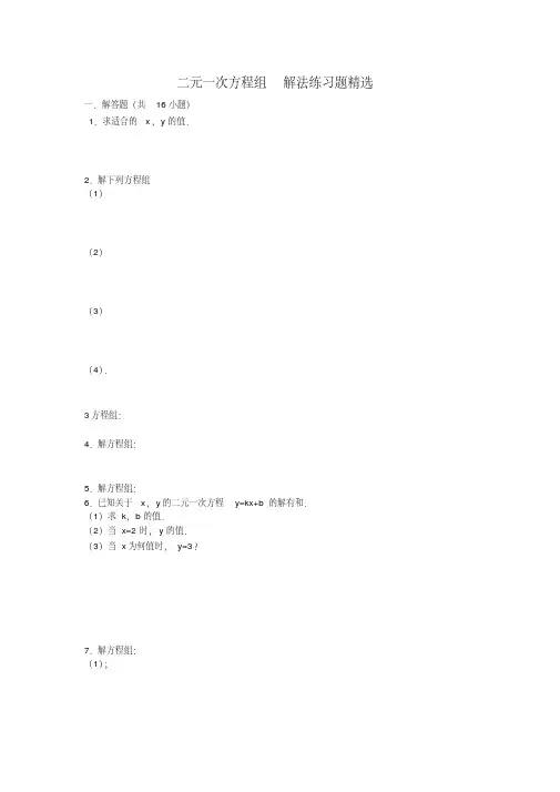 二元一次方程组解法练习题精选一.解答题(共16小题)1.求适合的x,y的值.2.解下列方程组(1)(2)(3)(4).3方程组:4.解方程组:5.解方程组:6.已知关于x,y的二元一次方程y=kx+b的解有和.(1)求k,b的值.(2)当x=2时,y的值.(3)当x为何值时,y=3?7.解方程组:(1);8.解方程组:9.解方程组:10.解下列方程组:(1)(2)11.解方程组:(1)(2)12.解二元一次方程组:(1);(2)13.在解方程组时,由于粗心,甲看错了方程组中的a,而得解为,乙看错了方程组中的b,而得解为.(1)甲把a看成了什么,乙把b看成了什么?(2)求出原方程组的正确解.15.解下列方程组:(1)(2).16.解下列方程组:(1)(2)二元一次方程组解法练习题精选(含答案)参考答案与试题解析一.解答题(共16小题)1.求适合的x,y的值.考点:解二元一次方程组.分析:先把两方程变形(去分母),得到一组新的方程,然后在用加减消元法消去未知数x,求出y的值,继而求出x的值.解答:解:由题意得:,由(1)×2得:3x﹣2y=2(3),由(2)×3得:6x+y=3(4),(3)×2得:6x﹣4y=4(5),(5)﹣(4)得:y=﹣,把y的值代入(3)得:x=,∴.点评:本题考查了二元一次方程组的解法,主要运用了加减消元法和代入法.2.解下列方程组(1)(2)(3)(4).考点:解二元一次方程组.分析:(1)(2)用代入消元法或加减消元法均可;(3)(4)应先去分母、去括号化简方程组,再进一步采用适宜的方法求解.解答:解:(1)①﹣②得,﹣x=﹣2,解得x=2,把x=2代入①得,2+y=1,解得y=﹣1.故原方程组的解为.(2)①×3﹣②×2得,﹣13y=﹣39,解得,y=3,把y=3代入①得,2x﹣3×3=﹣5,解得x=2.故原方程组的解为.(3)原方程组可化为,①+②得,6x=36,x=6,①﹣②得,8y=﹣4,y=﹣.所以原方程组的解为.(4)原方程组可化为:,①×2+②得,x=,把x=代入②得,3×﹣4y=6,y=﹣.所以原方程组的解为.点评:利用消元法解方程组,要根据未知数的系数特点选择代入法还是加减法:①相同未知数的系数相同或互为相反数时,宜用加减法;②其中一个未知数的系数为1时,宜用代入法.3.解方程组:考点:解二元一次方程组.专题:计算题.分析:先化简方程组,再进一步根据方程组的特点选用相应的方法:用加减法.解答:解:原方程组可化为,①×4﹣②×3,得7x=42,解得x=6.把x=6代入①,得y=4.所以方程组的解为.点评:注意:二元一次方程组无论多复杂,解二元一次方程组的基本思想都是消元.消元的方法有代入法和加减法.4.解方程组:考点:解二元一次方程组.专题:计算题.分析:把原方程组化简后,观察形式,选用合适的解法,此题用加减法求解比较简单.解答:解:(1)原方程组化为,①+②得:6x=18,∴x=3.代入①得:y=.所以原方程组的解为.点评:要注意:两个二元一次方程中同一未知数的系数相反或相等时,把这两个方程的两边相加或相减,就能消去这个未知数,得到一个一元一次方程,这种方法叫做加减消元法.本题适合用此法.5.解方程组:考点:解二元一次方程组.专题:计算题;换元法.分析:本题用加减消元法即可或运用换元法求解.解答:解:,①﹣②,得s+t=4,①+②,得s﹣t=6,解得.所以方程组的解为.点评:此题较简单,要熟练解方程组的基本方法:代入消元法和加减消元法.6.已知关于x,y的二元一次方程y=kx+b的解有和.(1)求k,b的值.(2)当x=2时,y的值.(3)当x为何值时,y=3?考点:解二元一次方程组.专题:计算题.分析:(1)将两组x,y的值代入方程得出关于k、b的二元一次方程组,再运用加减消元法求出k、b的值.(2)将(1)中的k、b代入,再把x=2代入化简即可得出y的值.(3)将(1)中的k、b和y=3代入方程化简即可得出x的值.解答:解:(1)依题意得:①﹣②得:2=4k,所以k=,所以b=.(2)由y=x+,把x=2代入,得y=.(3)由y=x+把y=3代入,得x=1.点评:本题考查的是二元一次方程的代入消元法和加减消元法,通过已知条件的代入,可得出要求的数.7.解方程组:(1);(2).考点:解二元一次方程组.分析:根据各方程组的特点选用相应的方法:(1)先去分母再用加减法,(2)先去括号,再转化为整式方程解答.解答:解:(1)原方程组可化为,①×2﹣②得:y=﹣1,将y=﹣1代入①得:x=1.∴方程组的解为;(2)原方程可化为,①×2+②得:17x=51,x=3,将x=3代入x﹣4y=3中得:y=0.∴方程组的解为.点评:这类题目的解题关键是理解解方程组的基本思想是消元,掌握消元的方法有:加减消元法和代入消元法.根据未知数系数的特点,选择合适的方法.8.解方程组:考点:解二元一次方程组.专题:计算题.分析:本题应把方程组化简后,观察方程的形式,选用合适的方法求解.解答:解:原方程组可化为,①+②,得10x=30,x=3,代入①,得15+3y=15,y=0.则原方程组的解为.点评:解答此题应根据各方程组的特点,有括号的去括号,有分母的去分母,然后再用代入法或加减消元法解方程组.9.解方程组:考点:解二元一次方程组.专题:计算题.分析:本题为了计算方便,可先把(2)去分母,然后运用加减消元法解本题.解答:解:原方程变形为:,两个方程相加,得4x=12,x=3.把x=3代入第一个方程,得4y=11,y=.解之得.点评:本题考查的是二元一次方程组的解法,方程中含有分母的要先化去分母,再对方程进行化简、消元,即可解出此类题目.10.解下列方程组:(1)(2)考点:解二元一次方程组.专题:计算题.分析:此题根据观察可知:(1)运用代入法,把①代入②,可得出x,y的值;(2)先将方程组化为整系数方程组,再利用加减消元法求解.解答:解:(1),由①,得x=4+y③,代入②,得4(4+y)+2y=﹣1,所以y=﹣,把y=﹣代入③,得x=4﹣=.所以原方程组的解为.(2)原方程组整理为,③×2﹣④×3,得y=﹣24,把y=﹣24代入④,得x=60,所以原方程组的解为.点评:此题考查的是对二元一次方程组的解法的运用和理解,学生可以