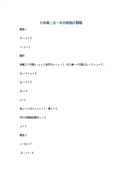 七年级二元一次方程组计算题题目 12x + y = 5x - y = 1解析:将第二个方程x - y = 1变形为x = y + 1,代入第一个方程2(y + 1) + y = 5,2y + 2 + y = 53y + 2 = 53y = 3y = 1将y = 1代入x = y + 1,得x = 2所以方程组的解为x = 2y = 1题目 2x + 3y = 72x - y = - 4解析:由第二个方程2x - y = - 4变形得y = 2x + 4,代入第一个方程x + 3(2x + 4) = 7,x + 6x + 12 = 77x + 12 = 77x = - 5x = - (5)/(7)将x = - (5)/(7)代入y = 2x + 4,得y = (18)/(7)所以方程组的解为x = - (5)/(7)y = (18)/(7)题目 33x - 2y = 82x + 3y = 1解析:第一个方程乘以 3,第二个方程乘以 2,得到:9x - 6y = 244x + 6y = 2两式相加:13x = 26,x = 2将x = 2代入3x - 2y = 8,得6 - 2y = 8,y = - 1所以方程组的解为x = 2y = - 1题目 45x + 2y = 123x + 2y = 6解析:第一个方程减去第二个方程:5x + 2y - (3x + 2y) = 12 - 65x + 2y - 3x - 2y = 62x = 6x = 3将x = 3代入3x + 2y = 6,得9 + 2y = 6,2y = - 3,y = - (3)/(2) 所以方程组的解为x = 3y = - (3)/(2)4x - 3y = 112x + y = 13解析:由第二个方程2x + y = 13变形得y = 13 - 2x,代入第一个方程4x - 3(13 - 2x) = 11,4x - 39 + 6x = 1110x - 39 = 1110x = 50x = 5将x = 5代入y = 13 - 2x,得y = 3所以方程组的解为x = 5y = 3题目 6x + 4y = 14(x - 3)/(4) - (y - 3)/(3) = (1)/(12)将第二个方程变形为:3(x - 3) - 4(y - 3) = 13x - 9 - 4y + 12 = 13x - 4y = - 2由第一个方程x + 4y = 14与变形后的方程相加:4x = 12,x = 3将x = 3代入x + 4y = 14,得3 + 4y = 14,4y = 11,y = (11)/(4) 所以方程组的解为x = 3y = (11)/(4)题目 73x + 2y = 5x + 22(3x + 2y) = 11x + 7解析:由第一个方程3x + 2y = 5x + 2,得2y - 2x = 2,y - x = 1,y = x + 1 将y = x + 1代入第二个方程2(3x + 2(x + 1)) = 11x + 72(3x + 2x + 2) = 11x + 72(5x + 2) = 11x + 710x + 4 = 11x + 7x = - 3将x = - 3代入y = x + 1,得y = - 2所以方程组的解为x = - 3y = - 2题目 8(x)/(3) + (y)/(4) = 1(x)/(2) - (y)/(3) = - 1解析:第一个方程乘以 12,第二个方程乘以 6,得到:4x + 3y = 123x - 2y = - 6第一个方程乘以 2,第二个方程乘以 3,得到:8x + 6y = 249x - 6y = - 18两式相加:17x = 6,x = (6)/(17)将x = (6)/(17)代入4x + 3y = 12,得(24)/(17) + 3y = 12,3y = (180)/(17),y = (60)/(17)所以方程组的解为x = (6)/(17)y = (60)/(17)题目 92(x - 150) = 5(3y + 50)10% x + 6% y = 8.5% × 800解析:将第一个方程化简为2x - 300 = 15y + 250,2x - 15y = 550第二个方程化简为0.1x + 0.06y = 68,10x + 6y = 6800,5x + 3y = 3400 第一个方程乘以 3,得到6x - 45y = 1650第二个方程乘以 15,得到75x + 45y = 51000两式相加:81x = 52650,x = 650将x = 650代入5x + 3y = 3400,得3250 + 3y = 3400,3y = 150,y = 50 所以方程组的解为x = 650y = 50题目 103(x + y) - 4(x - y) = 4(x + y)/(2) + (x - y)/(6) = 1解析:将第一个方程化简为3x + 3y - 4x + 4y = 4,-x + 7y = 4,x = 7y - 4 将x = 7y - 4代入第二个方程(7y - 4 + y)/(2) + (7y - 4 - y)/(6) = 1 (8y - 4)/(2) + (6y - 4)/(6) = 13(8y - 4) + 6y - 4 = 624y - 12 + 6y - 4 = 630y = 22y = (11)/(15)将y = (11)/(15)代入x = 7y - 4,得x = (17)/(15)所以方程组的解为x = (17)/(15)y = (11)/(15)题目 112x - 3y = 5解析:第一个方程乘以 2,得到4x - 6y = 10第二个方程减去上式,4x + 5y - (4x - 6y) = 17 - 104x + 5y - 4x + 6y = 711y = 7y = (7)/(11)将y = (7)/(11)代入2x - 3y = 5,2x - (21)/(11) = 5,2x = (76)/(11),x = (38)/(11)所以方程组的解为x = (38)/(11)y = (7)/(11)题目 123x + 4y = 165x - 6y = 33解析:第一个方程乘以 3,第二个方程乘以 2,得到:10x - 12y = 66两式相加:19x = 114,x = 6将x = 6代入3x + 4y = 16,18 + 4y = 16,4y = - 2,y = - (1)/(2) 所以方程组的解为x = 6y = - (1)/(2)题目 13(x + y)/(2) + (x - y)/(3) = 62(x + y) - 3(x - y) = 24解析:第一个方程去分母得:3(x + y) + 2(x - y) = 363x + 3y + 2x - 2y = 365x + y = 36 ①第二个方程去括号得:2x + 2y - 3x + 3y = 24-x + 5y = 24 ②① + ②×5 得:5x + y + (- 5x + 25y) = 36 + 12026y = 156y = 6将y = 6代入①得:5x + 6 = 36,5x = 30,x = 6所以方程组的解为x = 6y = 6题目 143(x - 1) = y + 55(y - 1) = 3(x + 5)解析:将第一个方程化简为3x - 3 = y + 5,3x - y = 8 ①将第二个方程化简为5y - 5 = 3x + 15, - 3x + 5y = 20 ②① + ②得:4y = 28,y = 7将y = 7代入①得:3x - 7 = 8,3x = 15,x = 5所以方程组的解为x = 5y = 7题目 15(2u)/(3) + (3v)/(4) = (1)/(2)(4u)/(5) + (5v)/(6) = (7)/(15)解析:第一个方程去分母得:8u + 9v = 6 ①第二个方程去分母得:24u + 25v = 14 ②①×3 - ②得:24u + 27v - (24u + 25v) = 18 - 142v = 4v = 2将v = 2代入①得:8u + 18 = 6,8u = - 12,u = - (3)/(2) 所以方程组的解为u = - (3)/(2)v = 2题目 165(x - 1) + 3(y + 1) = 104(x + 3) - 2(y - x) = 32解析:将第一个方程化简为5x + 3y = 12 ①将第二个方程化简为6x - 2y = 20 ②①×2 + ②×3 得:10x + 6y + 18x - 6y = 24 + 60 28x = 84x = 3将x = 3代入①得:15 + 3y = 12,3y = - 3,y = - 1 所以方程组的解为x = 3y = - 1题目 17(m + n)/(3) - (n - m)/(4) = 24m + (n)/(3) = 8解析:第一个方程去分母得:4(m + n) - 3(n - m) = 244m + 4n - 3n + 3m = 247m + n = 24 ①第二个方程变形为12m + n = 24 ②② - ①得:12m + n - (7m + n) = 24 - 245m = 0m = 0将m = 0代入①得:n = 24 所以方程组的解为m = 0 n = 24题目 18x + 2y = 93x - 2y = - 1解析:将两个方程相加:$x + 2。