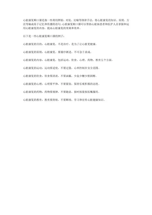 心脏康复顺口溜是指一些利用押韵、对仗、比喻等修辞手法,将心脏康复的知识、原则、方法等编成易于记忆和传播的语句。
