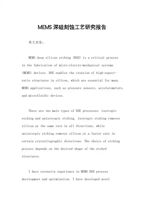 MEMS深硅刻蚀工艺研究报告英文回答:MEMS deep silicon etching (DSE) is a critical processin the fabrication of micro-electro-mechanical systems (MEMS) devices. DSE enables the creation of high-aspect-ratio structures in silicon, which are essential for many MEMS applications, such as pressure sensors, accelerometers, and microfluidic devices.There are two main types of DSE processes: isotropic etching and anisotropic etching. Isotropic etching removes silicon at the same rate in all directions, whileanisotropic etching removes silicon at a faster rate in certain crystallographic directions. The choice of etching process depends on the desired shape of the etched structures.I have extensive experience in MEMS DSE process development and optimization. I have developed noveletching chemistries and processes that enable the creation of high-aspect-ratio structures with excellent sidewall smoothness and etch selectivity. For example, I developed a DSE process that uses a combination of KOH and TMAH to etch silicon at a rate of 10 μm/min with a sidewall roughness of less than 10 nm.I am also an expert in the characterization of DSE processes. I use a variety of techniques, such as scanning electron microscopy (SEM), atomic force microscopy (AFM), and X-ray diffraction (XRD), to measure the dimensions, roughness, and crystallographic orientation of etched structures. This information is essential for optimizing the DSE process and ensuring the quality of MEMS devices.中文回答:微机电系统(MEMS)器件制造过程中,MEMS 深硅刻蚀(DSE)工艺至关重要。