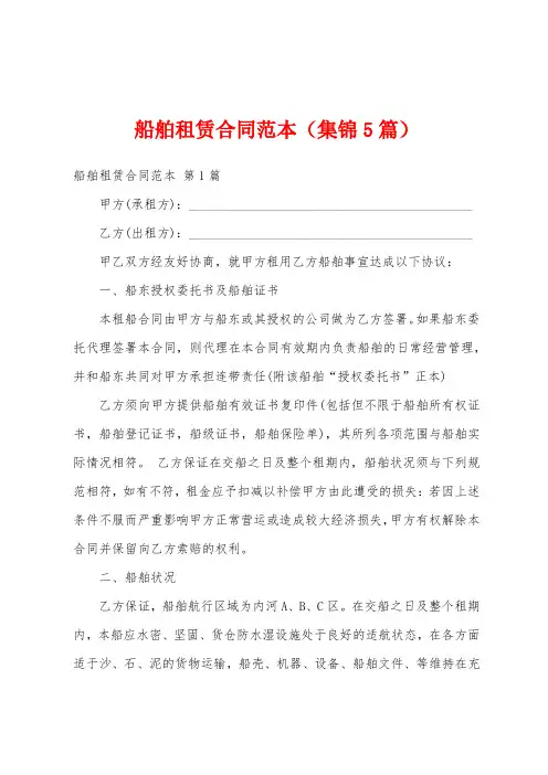 船舶租赁合同范本(集锦5篇)船舶租赁合同范本第1篇甲方(承租方):____________________________________________ 乙方(出租方):____________________________________________ 甲乙双方经友好协商,就甲方租用乙方船舶事宣达成以下协议:一、船东授权委托书及船舶证书本租船合同由甲方与船东或其授权的公司做为乙方签署。