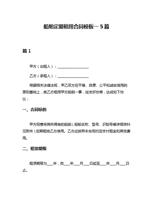 船舶定期租赁合同范本5篇篇1甲方(出租人):____________________乙方(承租人):____________________鉴于甲、乙双方就甲方拥有之船舶租赁事宜达成如下协议,为明确双方权利义务,确保合同目的之实现,特订立此船舶定期租赁合同。