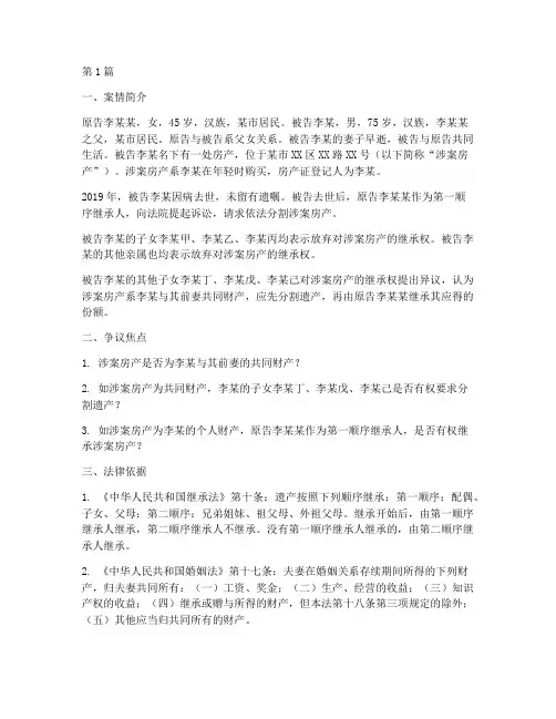 二、争议焦点1. 涉案房产是否为李某与其前妻的共同财产?2. 如涉案房产为共同财产,李某的子女李某丁、李某戊、李某己是否有权要求分割遗产?3. 如涉案房产为李某的个人财产,原告李某某作为第一顺序继承人,是否有权继承涉案房产?三、法律依据1. 《中华人民共和国继承法》第十条:遗产按照下列顺序继承:第一顺序:配偶、子女、父母;第二顺序:兄弟姐妹、祖父母、外祖父母。