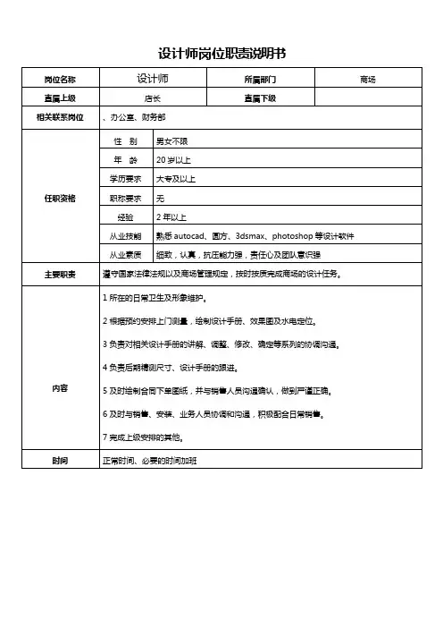 设计师岗位职责说明书设计师岗位职责说明书一、岗位背景设计师是公司中非常重要的一环,设计师的工作范围广泛,包括了平面设计、产品设计、室内设计等多个方面。