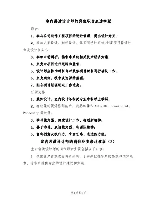 家装设计师的基本职责说明范文(2)家装设计师的基本职责包括以下方面:1. 客户需求分析与沟通家装设计师首要的责任是与客户进行充分的沟通,了解客户的需求和喜好。