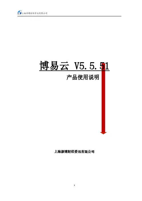 博易云 V5.5.51产品使用说明上海澎博财经资讯有限公司目录一、软件概述 (4)1.1软件概述 (4)1.2软件运行环境 (4)1.3系统配置 (4)1.4软件安装 (4)二、系统登录 (8)2.1系统登陆界面 (8)三、界面介绍 (10)3.1系统界面介绍 (10)3.2闪电图 (13)3.3分时走势图 (14)3.4K线图 (16)3.5新闻资讯 (18)四、页面设置 (19)4.1国内期货页面 (19)4.2期权报价页面 (20)4.3股指期货页面 (24)4.4热点排名页面 (25)4.5新闻资讯页面 (26)4.6自定义页面 (27)4.7期权策略页面 (32)五、板块设置 (35)5.1选择板块 (35)5.2新建板块 (36)5.3修改板块 (39)5.4删除板块 (41)六、分时图 (42)6.1信息窗口 (42)6.2历史回忆 (44)6.5商品叠加 (47)6.6分时走势图的指标 (50)七、K线图 (50)7.1更换K线周期 (50)7.2坐标 (51)7.3商品叠加 (55)7.4套利分析 (57)7.5指标 (59)7.6区间统计 (64)八、补充说明 (65)8.1显示/隐藏信息窗口 (65)8.2切换显示风格 (66)8.3颜色字体 (68)8.4预警 (70)8.5快捷键 (72)8.6画线工具 (73)8.7报价排 (78)九、退出与卸载 (78)9.1退出系统 (78)9.2卸载软件 (79)一、软件概述1.1 软件概述博易大师是国内主流的期货、证券及外汇行情显示软件,支持国内、国际期货、金融指数、外汇、期权仿真等市场的实时行情及图表显示,支持24小时全球品种看盘需求。