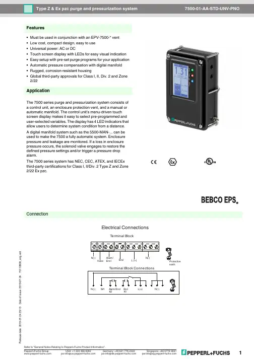 19-07-24 23:13D a t e o f i s s u e 2019-07-2470110808_e n g .x m lConnectionElectrical ConnectionsTerminal Block•Must be used in conjunction with an EPV-7500-* vent •Low cost, compact design, easy to use •Universal power: AC or DC•Touch screen display with LEDs for easy visual indication •Easy setup with pre-set purge programs for your application •Automatic pressure compensation with digital manifold •Rugged, corrosion-resistant housing•Global third-party approvals for Class I, II, Div. 2 and Zone 2/22ApplicationThe 7500 series purge and pressurization system consists of a control unit, an enclosure protection vent, and a manual or automatic manifold. The control unit’s menu-driven touch screen display makes it easy to select pre-programmed and user-selected variables. The display has 4 LED indicators that allow users to determine system condition from a distance.A digital manifold system such as the 5500-MAN-... can be used to make the 7500 a fully automatic system. Enclosure pressure and leakage are monitored. If a loss in enclosure pressure occurs, the solenoid valve engages to restore the defined pressure settings and/or trigger a pressure drop alarm.The 7500 series system has NEC, CEC, ATEX, and IECEx third-party certifications for Class I, II/Div. 2 Type Z and Zone 2/22 Ex pzc.Features19-07-24 23:13D a t e o f i s s u e 2019-07-2470110808_e n g .x ml General specifications Equipment architecture max. enclosure size 450 ft 3 (12.7 m 3)Operating mode fully automatic (FA)Series 7500Hazardous environment gas or dustSupply Rated voltage U r20 ... 30 V DC at 0.1 A90 ... 250 V AC , 50 ... 60 Hz at 0.04 A without solenoid valve Supply voltage can be line-to-line or line-to-neutral, single phase OVC IIPower consumption ≤ 2.7 W / 7.3 VA without valveElectrical specifications Connection screw terminals -- see manual for specifications on wire size and torque values Output Output IConnection K1, terminals, 1 x NO Output type enclosure power contactsContact loading 5 A at 250 V AC , 5 A at 30 V DC, relays must be externally fused inrush current: 50 A Output IIConnection K2, terminals, 1 x NO Output type alarm and control contactsContact loading 5 A at 250 V AC , 5 A at 30 V DC, relays must be externally fused inrush current: 50 A Output IIIConnection K3, terminals, L1 powered contact Output type solenoid manifold, contact Inrush current 5 AContact loading 0.5 A at 250 V AC , 0.5 A at 30 V DC, relays must be externally fusedIndicators/settings LED indicationK1: Green - Contact K1 is energized (enclosure contacts) K2: Amber - Contact K2 is energized (alarm/control contacts) P/SV: Blue - Safe pressure P1 (minimum enclosure pressure)P/SV: Amber - Solenoid manifold is energized (purging/pressure compensation)Pneumatic parameters Protective gas supply compressed air or inert gas, 5 µm filter, free from oil Pressure requirement supply pressure: 20 ... 120 psig (1.4 ... 8.2 bar)Safe pressure 0.25 in wc (0.63 mbar) minimum for gas 0.65 in wc (1.63 mbar) minimum for dust Enclosure pressure 0 ... 10 in wc (0 ... 24.8 mbar)Directive conformity Electromagnetic compatibilityDirective 2014/30/EU EN 61326-1:2013 , FCC CFR 47, part 15, subpart B: 2017, Class A ICES-003, Issue 6:2016, Class A ITE RoHSDirective 2011/65/EU (RoHS) EN 50581:2012Conformity Accuracypressure sensing: ± 0.125 in wc (0.31 mbar)timers: ± 5 %Ambient conditions Ambient temperature Ambient temperature ranges depend on the T class. See the certificates.Storage temperature -40 ... 80 °C (-40 ... 176 °F)Relative humidity 5 ... 90 %, non-condensing Altitude≤ 2000 mVibration resistance 5 ... 100 Hz , 1 g, 12 m/s 2, all axes Impact resistance30 g, 11 ms, all axesMechanical specifications Connection typeelectrical: 2 x 1/2 inch NPTF (open from factory) 1 x M12 opening (plugged from factory)pneumatic: high-pressure port - 1/8 in NPTF, low-pressure port - 1/8 in NPTF Degree of protection Type 4X , IP66Materiallens: Makrolon® GP-V polycarbonatescrews: AISI 316 (1.4401), 304, or 18-8 stainless steel housing: A380, A356, or 6061-T6 aluminummounting gasket: Bisco® HT-800 medium cellular silicone19-07-24 23:13D a t e o f i s s u e 2019-07-2470110808_e n g .x ml Dimensions150 x 100 x 50 mm (5.9 x 4 x 2 in)Data for application in connection with hazardous areas CertificateMarking¬ II 3 G Ex ec nC [pzc] IIC T6...T4 Gc¬ II 3 D Ex tc [pzc] IIIC T60 °C ... T80 °C Dc Directive conformityDirective 2014/34/EU IEC/EN 60079-0 , IEC/EN 60079-2 , IEC/EN 60079-7 , IEC/EN 60079-15 , IEC/EN 60079-31 Supplements: EN 61010-1:2010, EN 61326-3-2:2008, EN 61000-6-2:2005International approvals UL approvalcULusClass I, Division 2, Groups A, B, C, D T4 (-40 °C ≤ Ta ≤ 70 °C)Class I, Division 2, Groups A, B, C, D T5 (-40 °C ≤ Ta ≤ 65 °C)Class I, Division 2, Groups A, B, C, D, T6 (-40 °C ≤ Ta ≤ 50 °C)Class II, Division 2, Groups F, G T4 (-40 °C ≤ Ta ≤ 70 °C)Class II, Division 2, Groups F, G T5 (-40 °C ≤ Ta ≤ 65 °C)Class II, Division 2, Groups F, G T6 (-40 °C ≤ Ta ≤ 50 °C)IECEx approval Ex ec nC [pzc] IIC T6...T4 GcEx tc [pzc] IIIC T60 °C ... T80 °C DcGeneral information Supplementary informationType Examination Certificate, Statement of Conformity, Declaration of Conformity, Attestation of Conformity and instructions have to be observed where applicable. For information see .AccessoriesEPV-7500-AA-017500 series purge and pressurization system vent, aluminum body and cap EPV-7500-AA-027500 series purge and pressurization system vent, aluminum body and cap EPV-7500-AA-037500 series purge and pressurization system vent, aluminum body and cap EPV-7500-AA-047500 series purge and pressurization system vent, aluminum body and cap EPV-7500-SS-017500 series purge and pressurization system vent, aluminum body, stainless steel cap EPV-7500-SS-027500 series purge and pressurization system vent, aluminum body, stainless steel cap EPV-7500-SS-037500 series purge and pressurization system vent, aluminum body, stainless steel