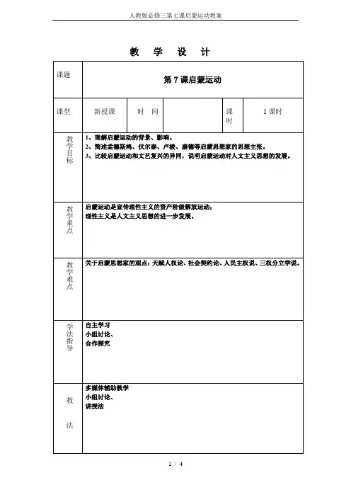 人教版历史必修三第7课《启蒙运动》教学设计第7课启蒙运动课标:简述孟德斯鸠、伏尔泰、卢梭、康德等启蒙思想家的观点,概括启蒙运动对人文主义思想的发展。