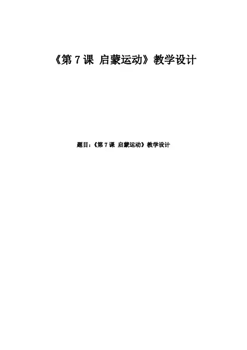 《第7课启蒙运动》教学设计题目:《第7课启蒙运动》教学设计第7课《启蒙运动》【课标要求】1.简述孟德斯鸠、伏尔泰、卢梭、康德等启蒙思想家的观点2.概括启蒙运动对人文主义思想的发展【教学目标】一、知识与能力1、通过本课的学习,使学生了解欧洲启蒙运动的背景和特点,掌握启蒙运动思想家的主要观点。