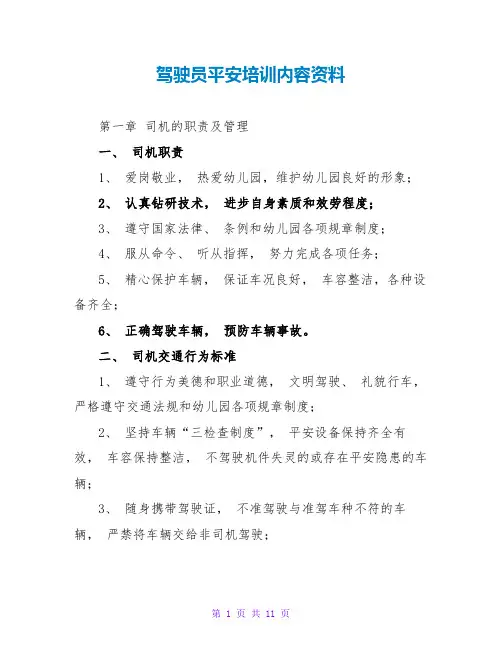 驾驶员平安培训内容资料第一章司机的职责及管理一、司机职责1、爱岗敬业,热爱幼儿园,维护幼儿园良好的形象;2、认真钻研技术,进步自身素质和效劳程度;3、遵守国家法律、条例和幼儿园各项规章制度;4、服从命令、听从指挥,努力完成各项任务;5、精心保护车辆,保证车况良好,车容整洁,各种设备齐全;6、正确驾驶车辆,预防车辆事故。