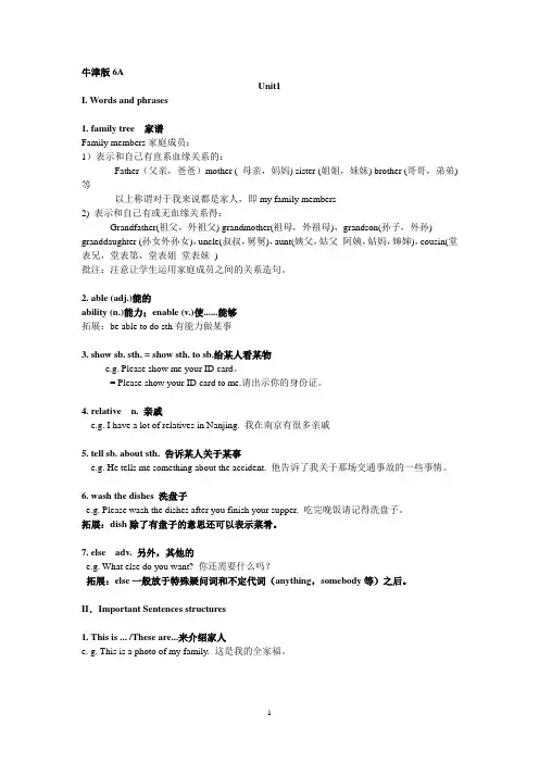 牛津版6AUnit1I. Words and phrases1. family tree 家谱Family members家庭成员:1)表示和自己有直系血缘关系的:Father(父亲,爸爸)mother ( 母亲,妈妈) sister (姐姐,妹妹) brother (哥哥,弟弟)等以上称谓对于我来说都是家人,即my family members2) 表示和自己有或无血缘关系得:Grandfather(祖父,外祖父) grandmother(祖母,外祖母),grandson(孙子,外孙) granddaughter (孙女外孙女),uncle(叔叔,舅舅),aunt(姨父,姑父阿姨,姑妈,婶婶),cousin(堂表兄,堂表第,堂表姐堂表妹)批注:注意让学生运用家庭成员之间的关系造句。