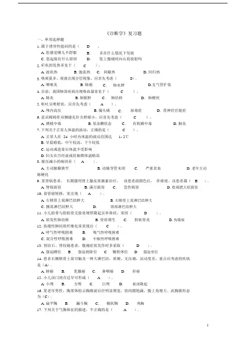 《诊断学》复习题一、单项选择题1. 属于诱导性提问的是( D 。