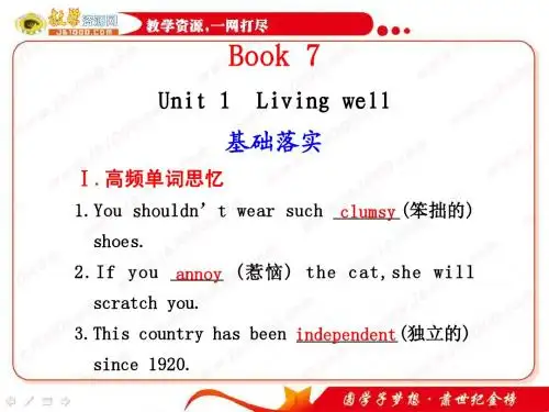 选修7Unit 1Living well1.clumsy adj.笨拙的1ambition n .抱负,理想;雄心;野心Her ambition is to become part of the national team for the next Paralympic Games.(教材P 1) 她的抱负是成为国家队一员并参加下届残奥会。