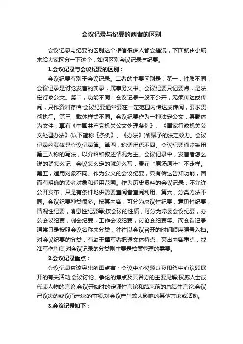 会议纪要与会议记录的区别会议纪要与会议记录的具体区别:1.性质上:会议纪要是法定行政公文;会议记录是机关、单位内部用于记录会议发言的事务文书2.内容上:会议纪要是经过整理加工的会议上达成一致认识,是会议内容的要点;会议记录是会议发言的原始记录,基本上要做到有言必录3.形式上:会议纪要基本上按照行政公文的规范格式;会议记录没有统一格式,多是各单位自定4.发分形式上:会议纪要按公文程序发,但没有主送和抄送机关;会议记录仅作为内部资料保存,绝不公开发布5.在提炼加工程度上有区别,会议记录,无论详细记录还是摘要记录,老师原始记载,参加会议的人怎么说就怎么记,既不能遗漏重要内容,更不能添枝加叶;会议纪要则是在记录的基础上,通过执笔人的分析综合后,摘其要点,舍其芜杂,按一定的逻辑顺序,编排加工而成。
