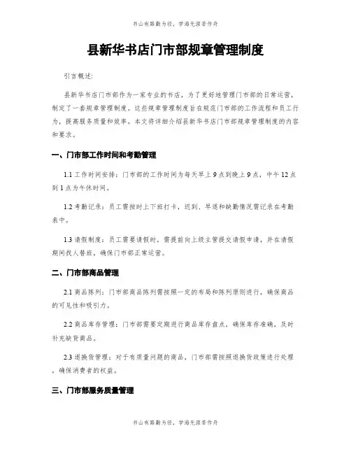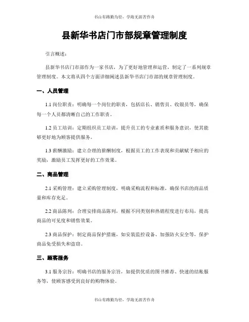 县新华书店门市部规章管理制度标题:县新华书店门市部规章管理制度引言概述:县新华书店门市部是一个重要的文化消费场所,为了规范门市部的管理和服务,制定了一系列的规章管理制度。