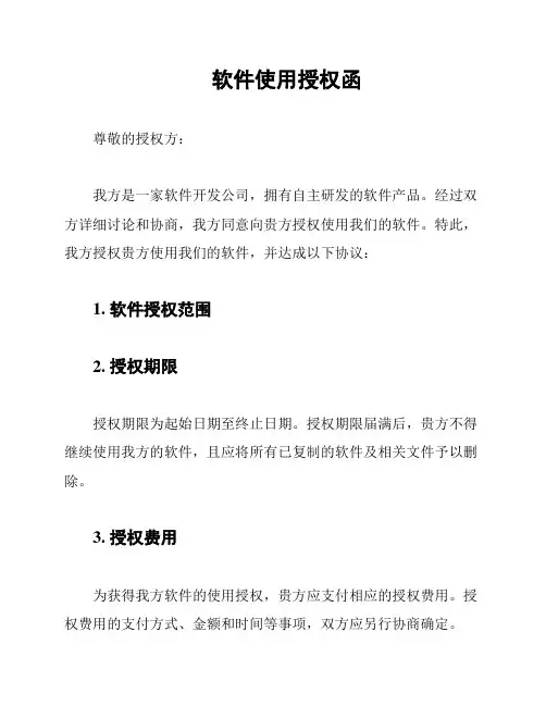 软件使用授权函尊敬的授权方:我方是一家软件开发公司,拥有自主研发的软件产品。