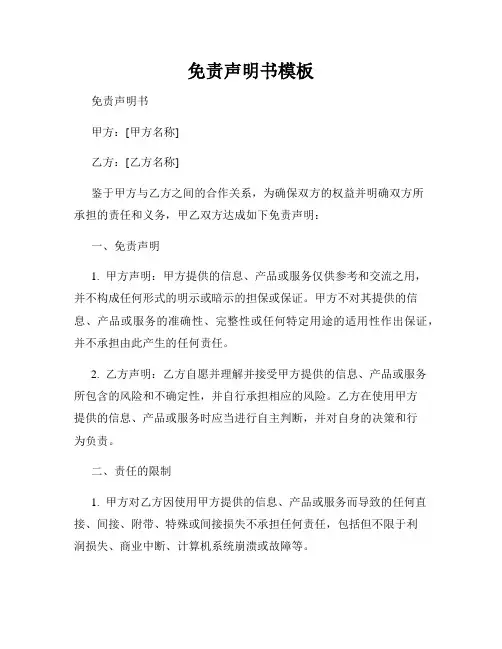 免责声明书模板免责声明书甲方:[甲方名称]乙方:[乙方名称]鉴于甲方与乙方之间的合作关系,为确保双方的权益并明确双方所承担的责任和义务,甲乙双方达成如下免责声明:一、免责声明1. 甲方声明:甲方提供的信息、产品或服务仅供参考和交流之用,并不构成任何形式的明示或暗示的担保或保证。