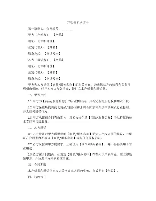 声明书和承诺书第一篇范文:合同编号:__________甲方(声明方):【全称】地址:【详细地址】法定代表人:【姓名】联系方式:【电话号码】乙方(承诺方):【全称】地址:【详细地址】法定代表人:【姓名】联系方式:【电话号码】甲方为乙方提供【商品/服务名称】的相关事宜,为确保双方的权利和义务得到明确保障,经甲乙双方友好协商,特订立本声明书和承诺书。