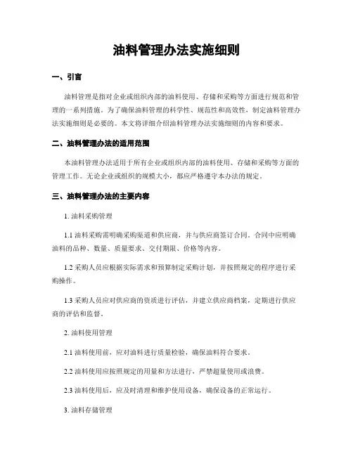 油料管理办法实施细则一、引言油料管理是指对企业、机构或个人在生产、经营和使用过程中所涉及的油料资源进行合理管理和有效利用的一系列措施。