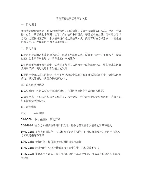手绘青春绘画活动策划方案一、活动概述手绘青春绘画活动是一种以手绘为载体,通过创作、交流和展示作品的方式,营造一种放松、创作、共享的艺术氛围,让青年们在绘画中发现美,感受艺术的力量,同时增加青年之间的交流和相互了解。