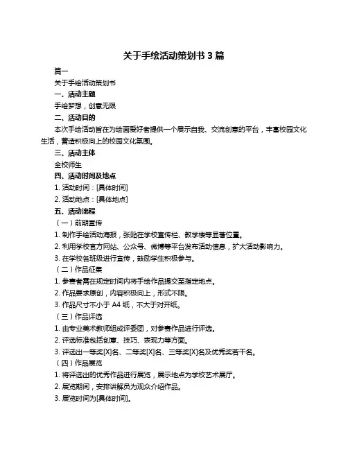关于手绘活动策划书3篇篇一关于手绘活动策划书一、活动主题手绘梦想,创意无限二、活动目的本次手绘活动旨在为绘画爱好者提供一个展示自我、交流创意的平台,丰富校园文化生活,营造积极向上的校园文化氛围。