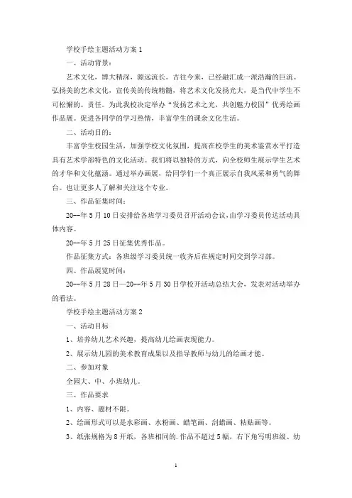 2. 手绘教学讲座(1)主讲人:知名画家或校内美术老师(2)讲座主题:绘画技巧、创意思维、审美培养等(3)讲座时间:活动前期3. 手绘展览(1)展览时间:活动结束后(2)展览地点:学校操场、教学楼前广场(3)展览内容:手绘比赛优秀作品、讲座现场作品等4. 手绘公益活动(1)活动对象:社区居民(2)活动内容:组织学生志愿者在社区开展手绘教学、绘画创作等活动,丰富社区居民的业余生活。