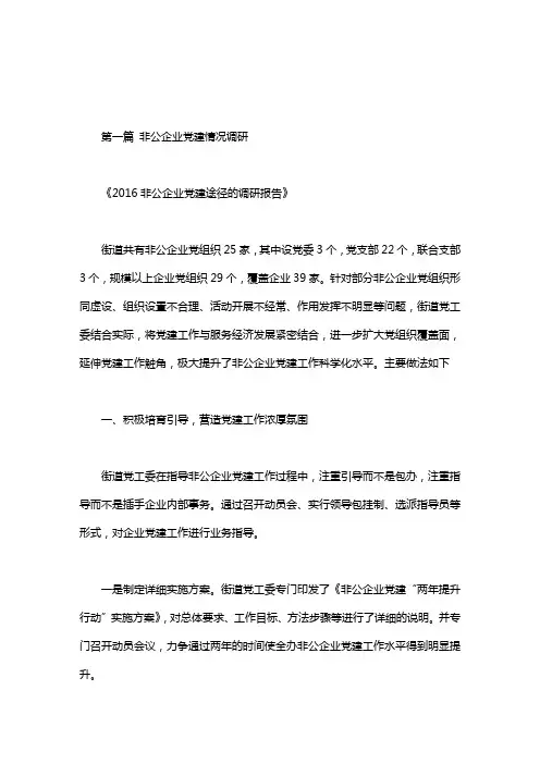 第一篇非公企业党建情况调研《2016非公企业党建途径的调研报告》街道共有非公企业党组织25家,其中设党委3个,党支部22个,联合支部3个,规模以上企业党组织29个,覆盖企业39家。