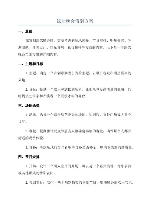 综艺晚会策划方案一、总则在策划综艺晚会时,需要考虑到场地选择、节目安排、明星嘉宾、导演团队、舞美设计、灯光音响、礼仪接待等方面的内容。