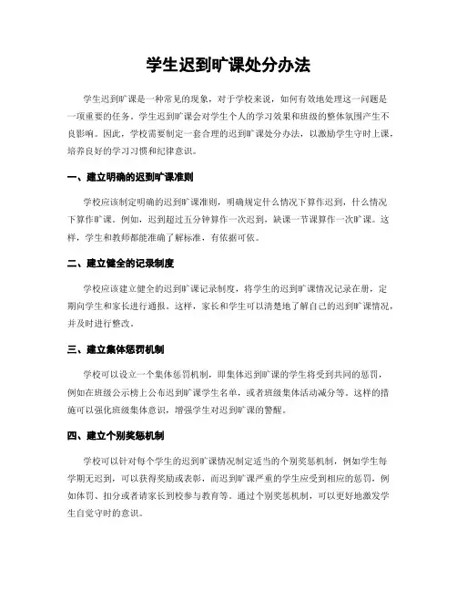 学生迟到旷课处分办法学生迟到旷课是一种常见的现象,对于学校来说,如何有效地处理这一问题是一项重要的任务。